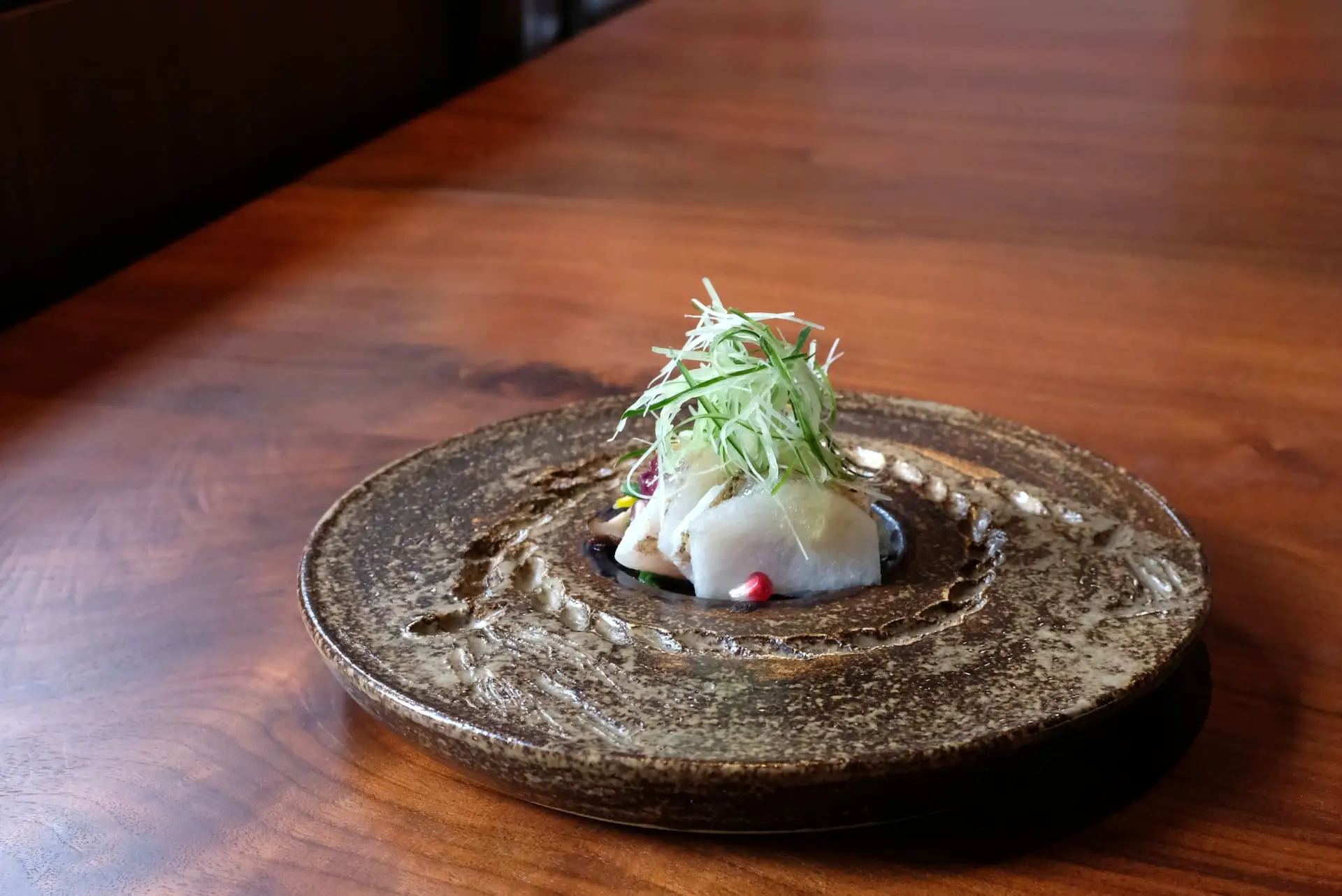 "We forage wild mountain plants within 30 minutes of the restaurant," says Matsuo. "Each ingredient is treated uniquely — bracken dressed with nasturtium and sesame purée, shidoke (a wild mountain plant) combined with praline and cacao nib miso for layered bitterness, mountain udo marinated and fried with spices."